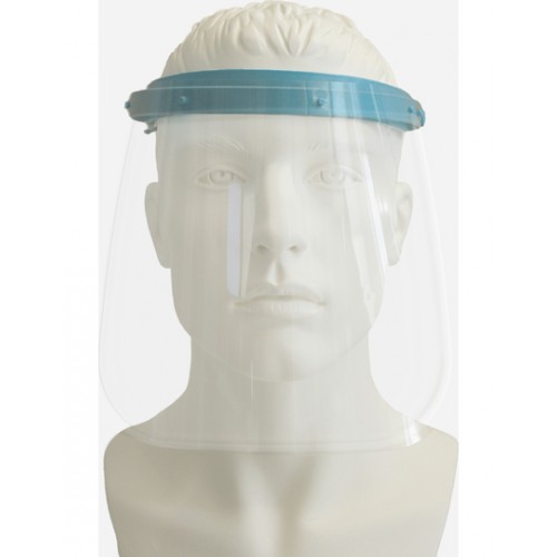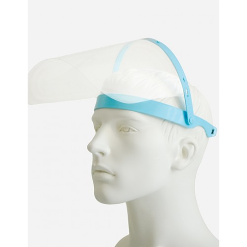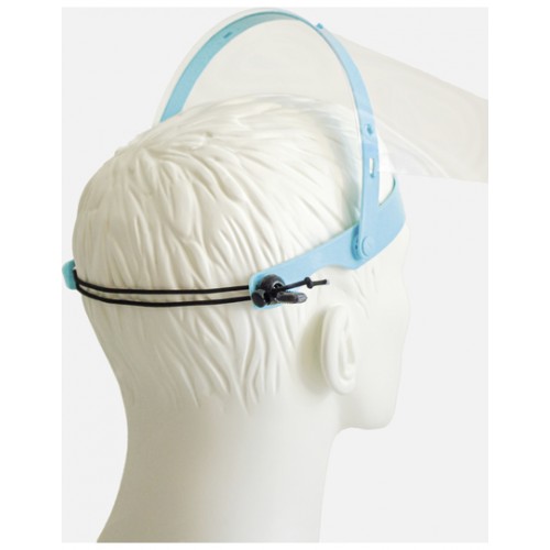 Caurspīdīgs sejas vairogs, kas izgatavots no PET G materiāla. Vairogam ir gumija, kas ļauj regulēt izmēru.