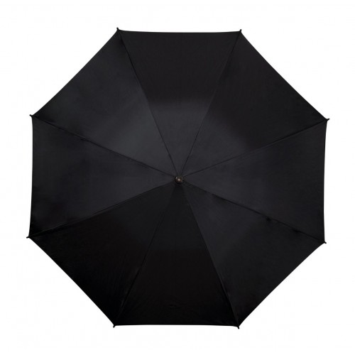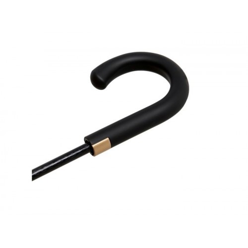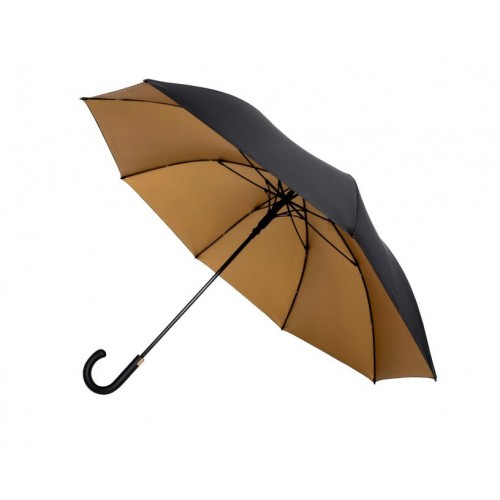 Melns lietussargs ar zelta iekšpusi, automātisks, vēja necaurlaidīgs, tumšas krāsas stiklšķiedras kāts un rāmis, stiklšķiedras ribas, melns līks rokturis.