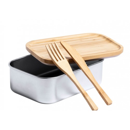 Pusdienu kaste no nerūsējošā tērauda ar dabīga bambusa vāku. Ar bambusa galda piederumu komplektu (nazis un dakšiņa) un elastīgu siksniņu, 600 ml.